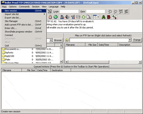| Â | How to Setup BulletProof FTPWith Bullet Proof FTP, interrupted file transfers are easy to resume. Should you encounter a disconnection when downloading files, Bullet Proof FTP will automatically reconnect and resume downloading. Features include automatic disconnection after downloading files, a queue that supports drag and drop, and a tray icon that displays the progress of file transfers. This program can also outsmart FTP servers that limit the number of files you can download in a session by automatically disconnecting and reconnecting until all of your desired downloads are complete. Click here to Download.1. Open BulletProof FTP and select 'Main' from the drop down menu and select 'New Session'. ![]() 2. Enter a name in the 'Site Name' field and set your 'Site Address' to 'UserID.seaex.com'. Enter your Hosting User ID in the 'Login' field and click 'Close'. ![]() 3. In the 'Options' menu click on 'General Options'. Select the 'Firewall' tab at the top of the dialog box and tick 'Use passive mode' if it is unchecked and click 'Ok'. ![]() |